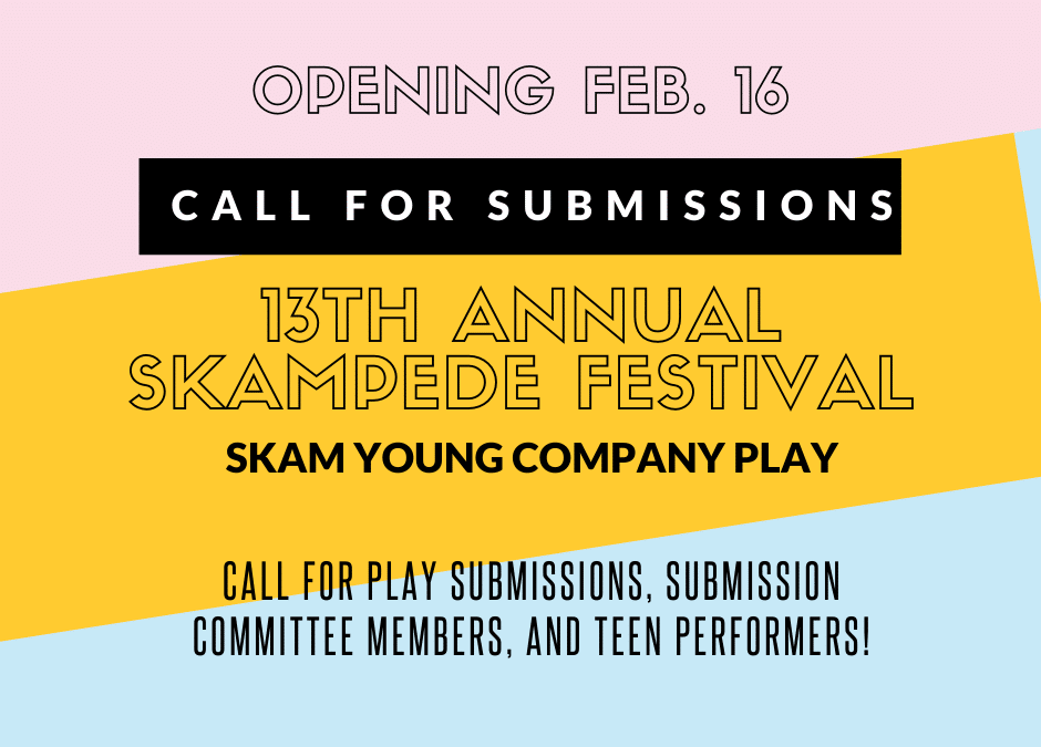 We are also seeking youth ages 15-22 to be on a Selection Committee to choose a play that youth will perform at SKAMpede. Selection occurs during March Break, the week of March 15-19. Youth Selection Committee members will read all submissions, score them, and discuss with peers. This is an opportunity to see how a professional selection committee functions. Selection Committee members will be paid an honorarium of $50.